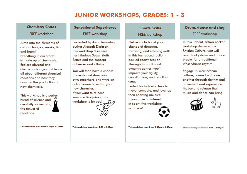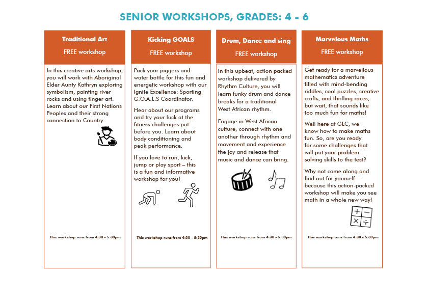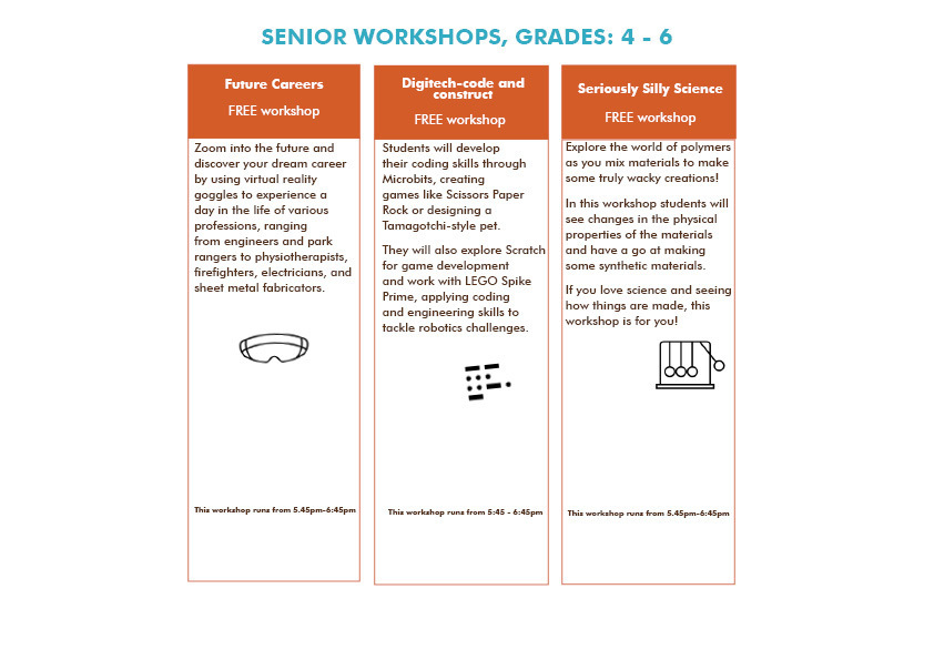 Parents/guardians can stay on site and enjoy the Open @ Twilight activities and food trucks whilst their child completes the workshop. All attendees are welcome to take part in this event before or after their workshop.